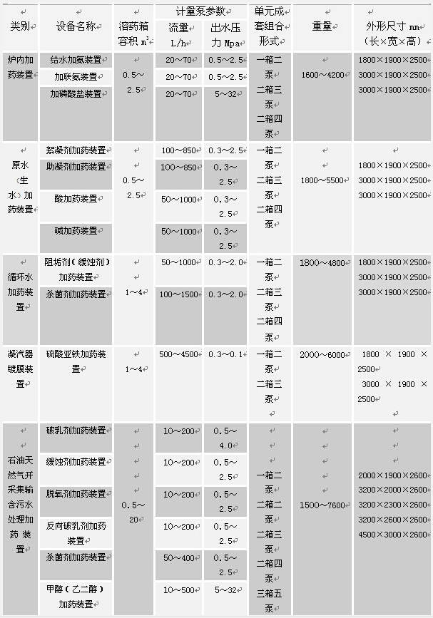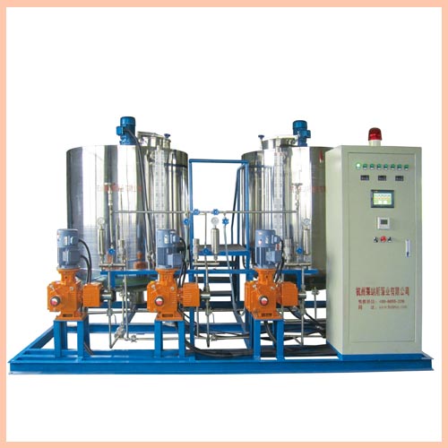本裝置主要包括藥液溶配系統、計量投加系統、安全系統和控制系統等四部分。固體藥劑加入溶箱內,然后按比例加入工業水攪拌溶解,由計量投加系統投加到投藥點。投加系統采用手動方式,也可依據上位系統輸出的控制信號進行控制,自動投加。
